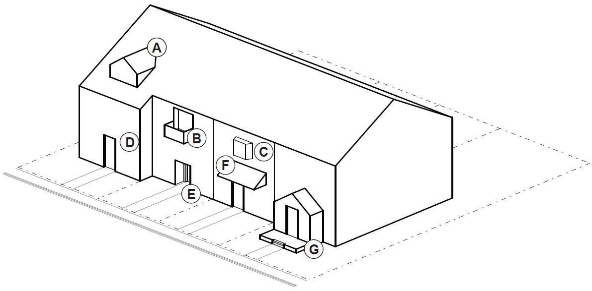 E. Facades. Cottages must meet the architectural design standards for singlefamily detached dwellings in Section 8.0141(5).B.1 through 4.