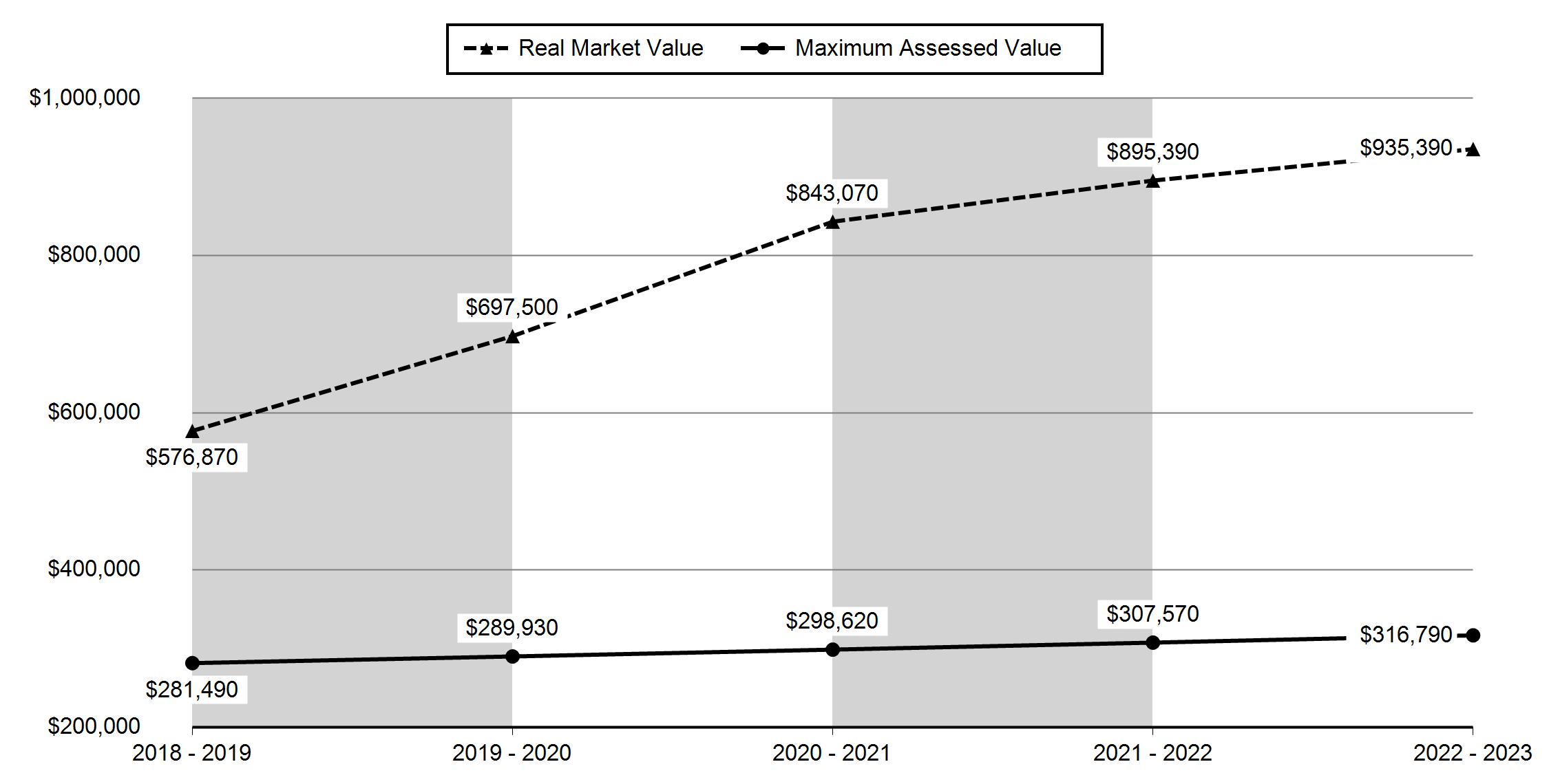 2018 - 2019 2019 - 2020 2020 - 2021 2021 - 2022 2022 - 2023 Real Market Value - Land $472,000 $536,000 $615,000 $656,000 $766,000 Real Market Value - Structures $104,870 $161,500 $228,070 $239,390 $169,390 Total Real Market Value $576,870 $697,500 $843,070 $895,390 $935,390 Maximum Assessed Value $281,490 $289,930 $298,620 $307,570 $316,790 Total Assessed Value $281,490 $289,930 $298,620 $307,570 $316,790 Veterans Exemption $0 $0 $0 $0 $0 Valuation History All values are as of January 1 of each year. Tax year is July 1st through June 30th of each year. Deschutes County Property Information Report, page 1
