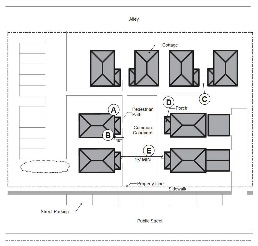 A. Cottage Orientation. Cottages must be clustered around a common courtyard, meaning they abut the associated common courtyard or are directly connected to it by a pedestrian path, and must meet the following standards (see Figure 1):