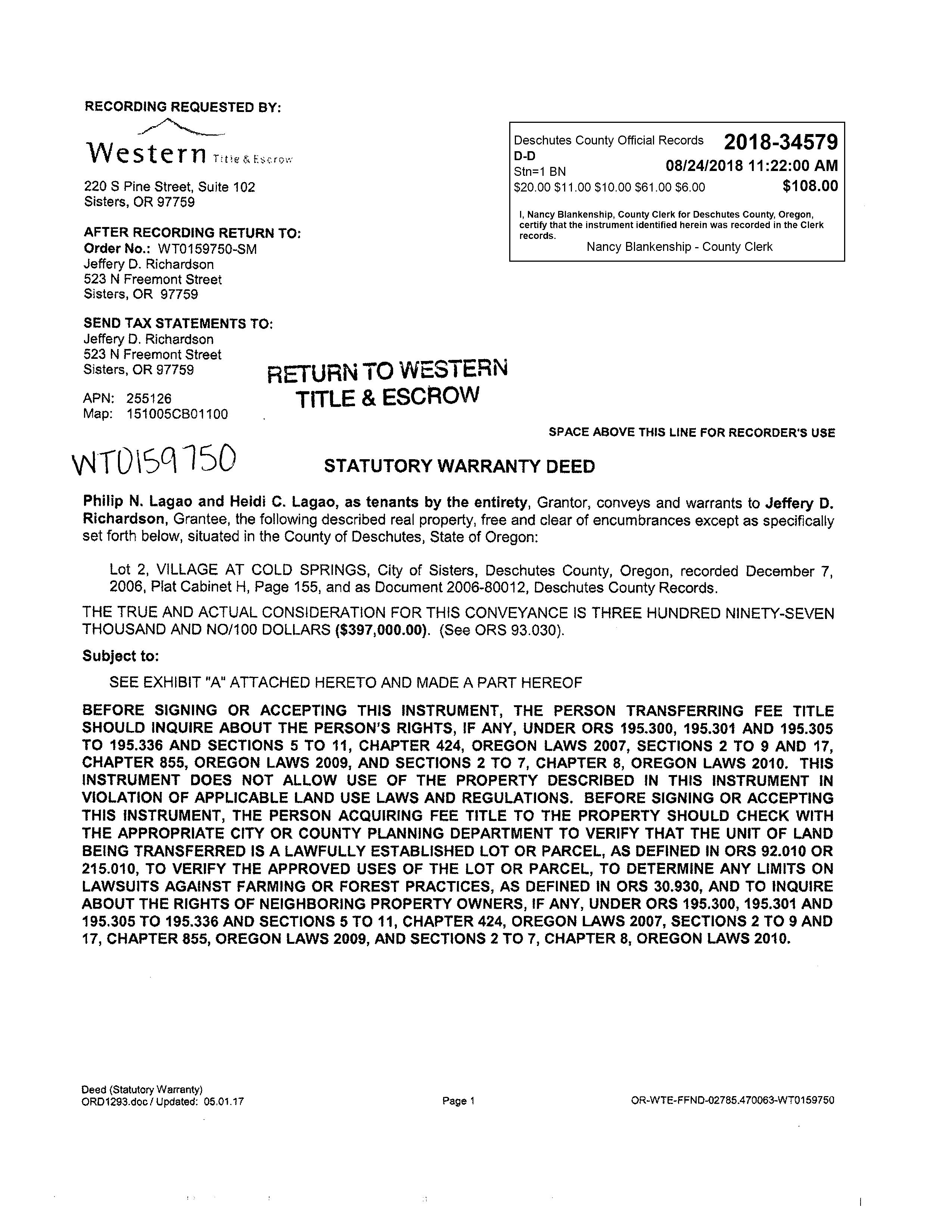 Deschutes County Title has provided this information as a courtesy and assumes no liability for the accuracy of the data and does not warranty the fitness of this product for any particular purpose. 523 N Freemont St.|Sisters|Oregon|97759 Bend 397 SW Upper Terrace Dr Bend, Oregon 97702 Office: 541.389.2120 Fax: 541.389.2180 Redmond 845 SW Veterans Way Redmond, Oregon 97756 Office: 541.527.1274 Fax: 541.527.1281 La Pine 51515 Huntington Rd La Pine, Oregon 97739 Office: 541.876.6990 Fax: 541.876.2740 St Helens 240 South First Street St. Helens, Oregon 97051 Office: 503.397.2587 Fax: 503.366.1708 HOMEBOOK www.deschutestitle.com