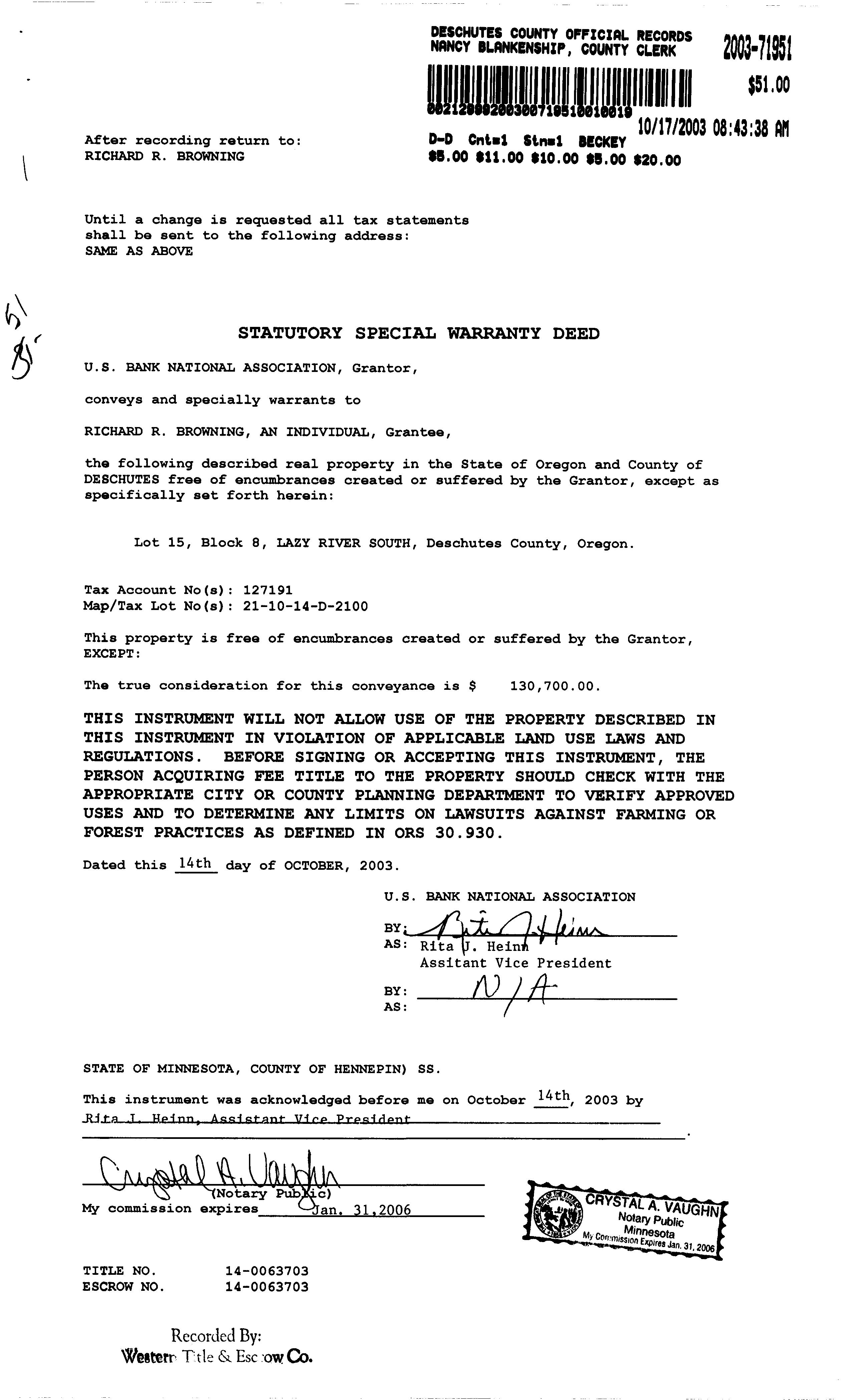 Review of digital records maintained by the Deschutes County Assessor’s Office, Tax Office, Finance Office, and the Community Development Department indicates that there are County tax, assessment, or property development related notations associated with this account and that have been identified above. Independent verification of the presence of additional Deschutes County tax, assessment, development, and other property related considerations is recommended. Confirmation is commonly provided by title companies, real estate agents, developers, engineering and surveying firms, and other parties who are involved in property transactions or property development. In addition, County departments may be contacted directly to discuss the information.