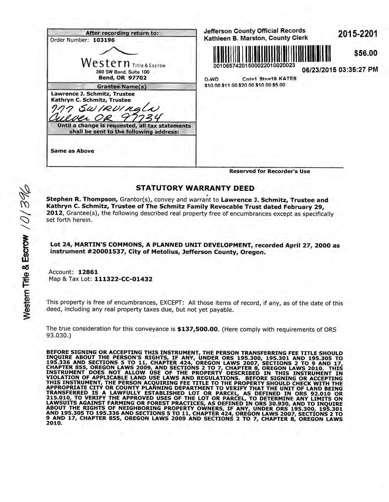 Mailing SCHMITZ FAMILY REVOCABLE TRUST SCHMITZ, KATHRYN J, TTEE 614 ANGUS LN