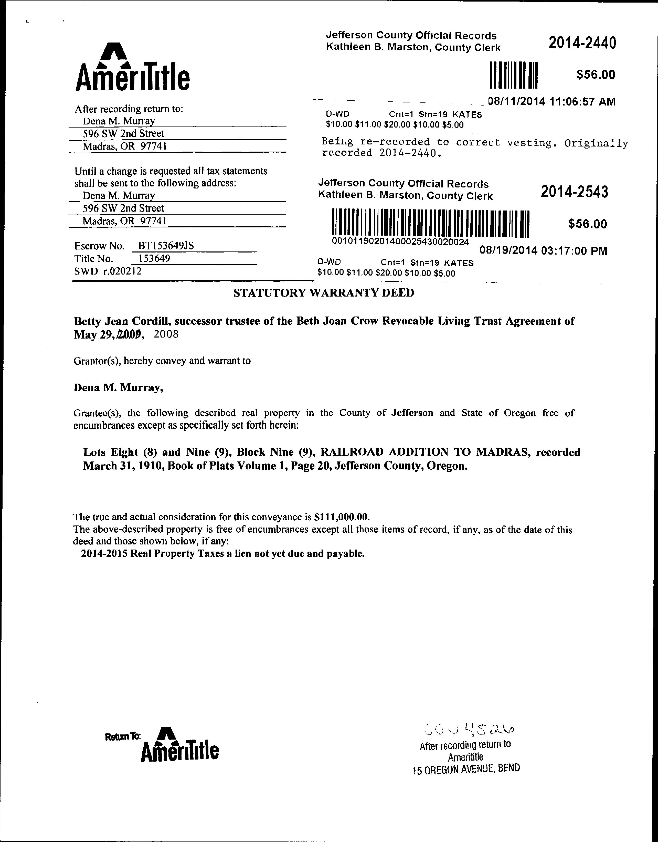 596 SW 2nd St|Madras|Oregon|97741 Deschutes County Title has provided this information as a courtesy and assumes no liability for the accuracy of the data and does not warranty the fitness of this product for any particular purpose. Bend 397 SW Upper Terrace Dr Bend, Oregon 97702 Office: 541.389.2120 Fax: 541.389.2180 Redmond 845 SW Veterans Way Redmond, Oregon 97756 Office: 541.527.1274 Fax: 541.527.1281 La Pine 51515 Huntington Rd La Pine, Oregon 97739 Office: 541.876.6990 Fax: 541.876.2740 St Helens 240 South First Street St. Helens, Oregon 97051 Office: 503.397.2587 Fax: 503.366.1708 HOMEBOOK www.deschutestitle.com