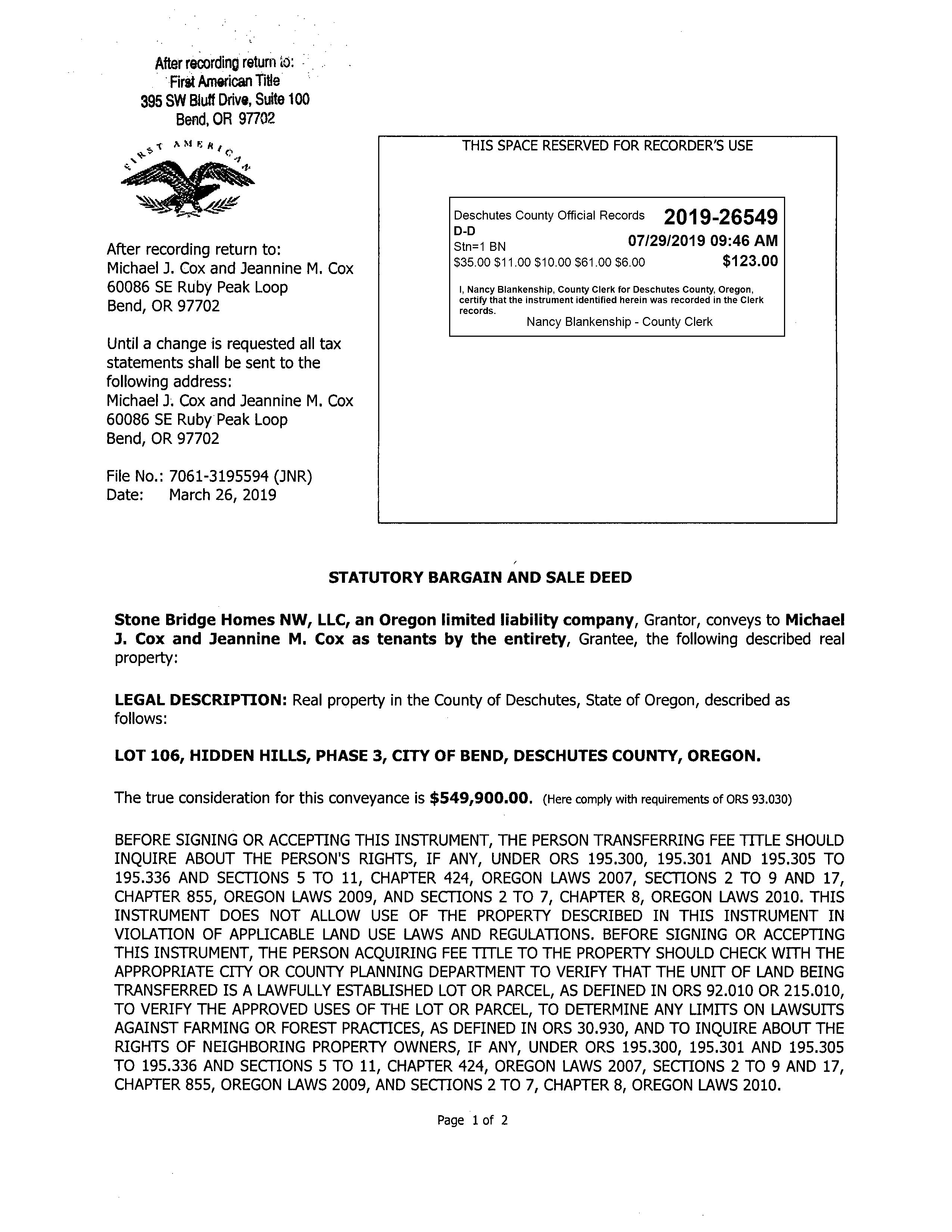 Deschutes County Title has provided this information as a courtesy and assumes no liability for the accuracy of the data and does not warranty the fitness of this product for any particular purpose. 60086 SE Ruby Peak Loop|Oregon|97702 Bend 397 SW Upper Terrace Dr Bend, Oregon 97702 Office: 541.389.2120 Fax: 541.389.2180 Redmond 845 SW Veterans Way Redmond, Oregon 97756 Office: 541.527.1274 Fax: 541.527.1281 La Pine 51515 Huntington Rd La Pine, Oregon 97739 Office: 541.876.6990 Fax: 541.876.2740 St Helens 240 South First Street St. Helens, Oregon 97051 Office: 503.397.2587 Fax: 503.366.1708 HOMEBOOK www.deschutestitle.com