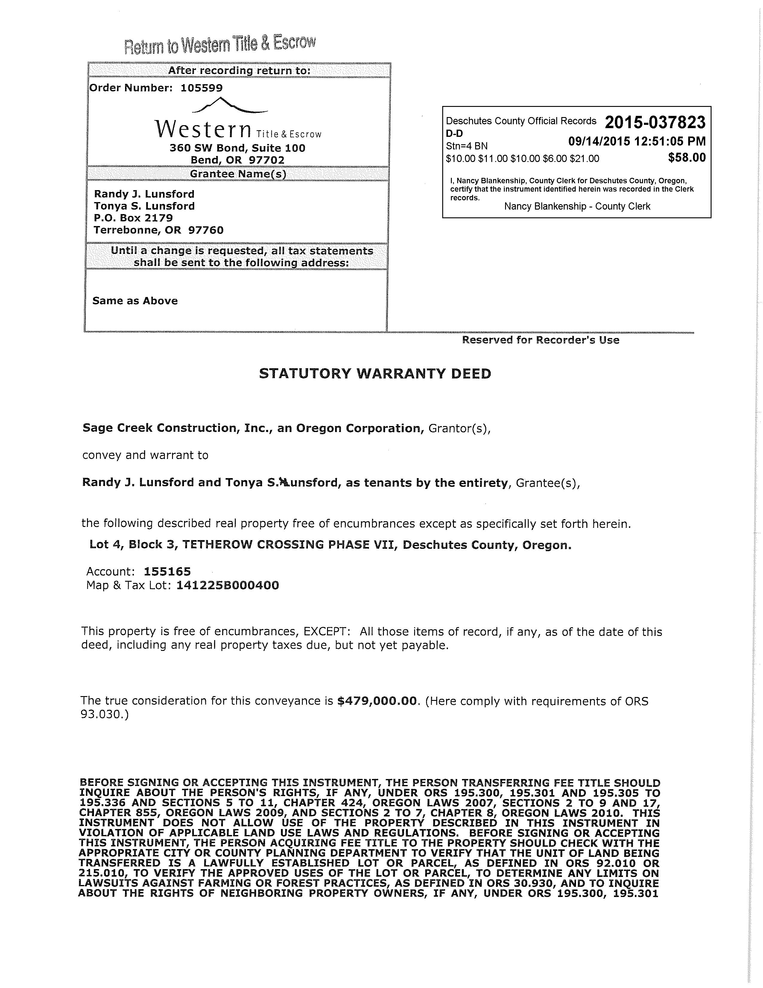Deschutes County Title has provided this information as a courtesy and assumes no liability for the accuracy of the data and does not warranty the fitness of this product for any particular purpose. 6295 NW 59th St|Redmond|Oregon|97756 Bend 397 SW Upper Terrace Dr Bend, Oregon 97702 Office: 541.389.2120 Fax: 541.389.2180 Redmond 845 SW Veterans Way Redmond, Oregon 97756 Office: 541.527.1274 Fax: 541.527.1281 La Pine 51515 Huntington Rd La Pine, Oregon 97739 Office: 541.876.6990 Fax: 541.876.2740 St Helens 240 South First Street St. Helens, Oregon 97051 Office: 503.397.2587 Fax: 503.366.1708 HOMEBOOK www.deschutestitle.com