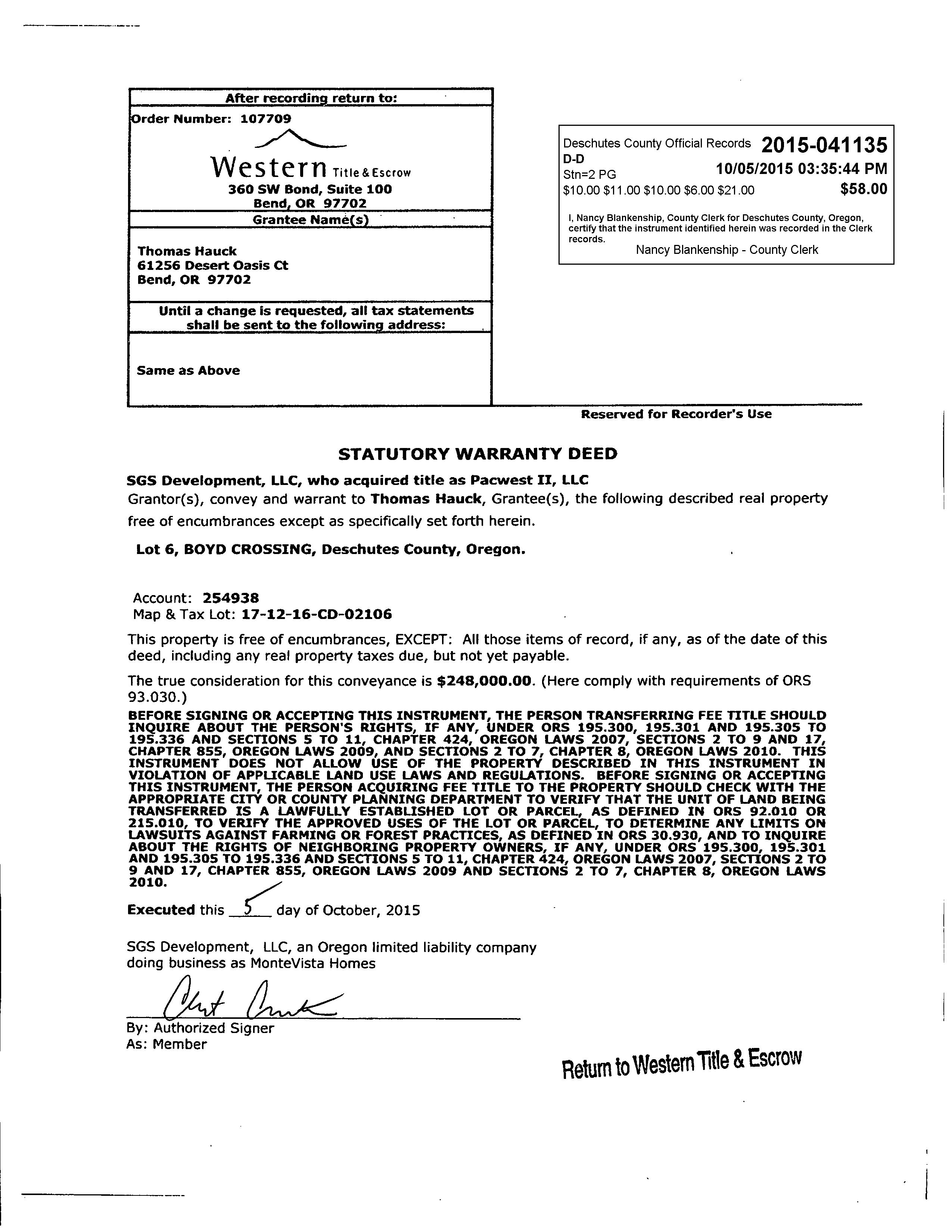 Review of digital records maintained by the Deschutes County Assessor’s Office, Tax Office, Finance Office, and the Community Development Department indicates that there are no special tax, assessment or property development related notations associated with this account. However, independent verification of the presence of other Deschutes County tax, assessment, development, and additional property related considerations is recommended. Confirmation is commonly provided by title companies, real estate agents, developers, engineering and surveying firms, and other parties who are involved in property transactions or property development. In addition, County departments may be contacted directly to discuss the information.