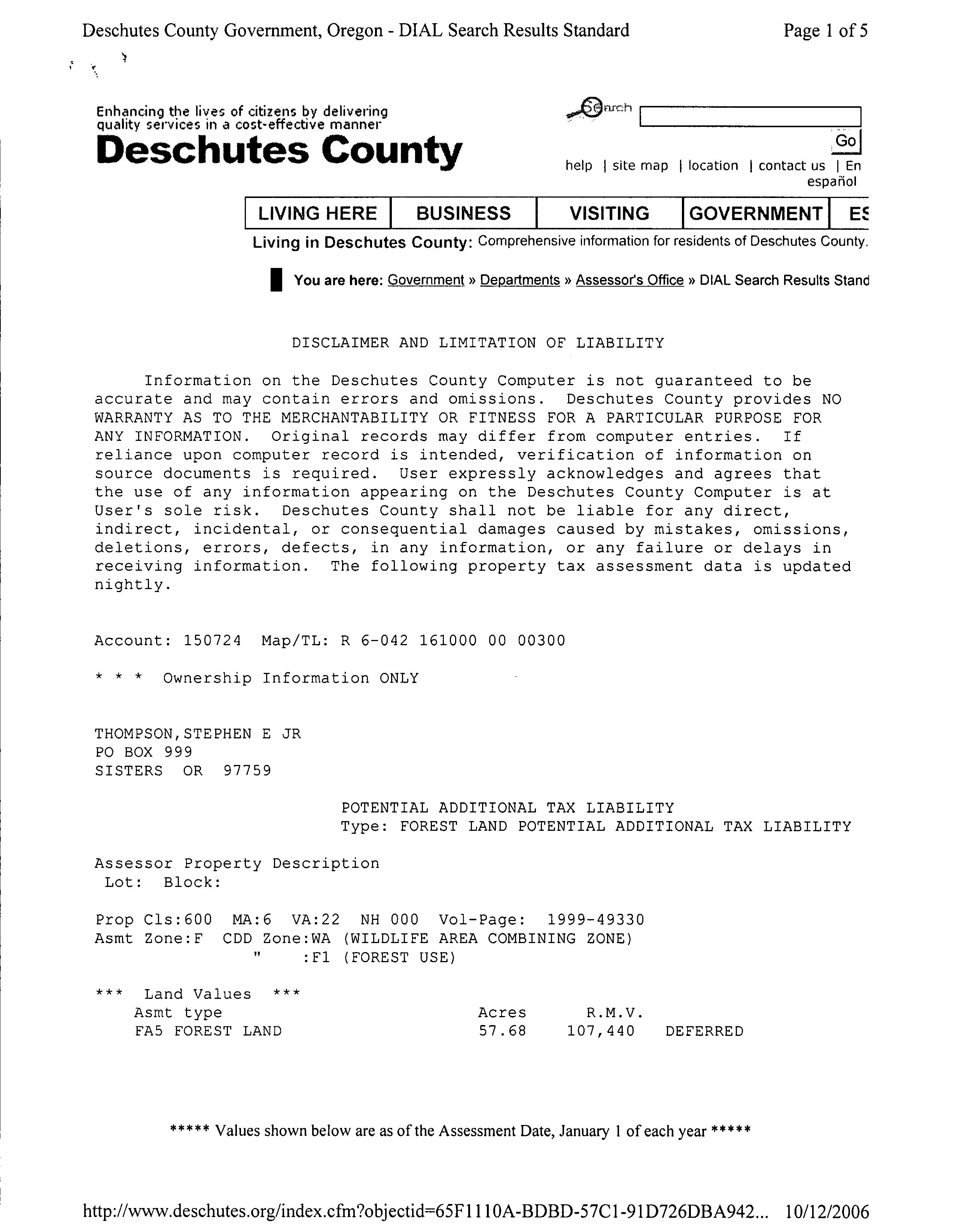 Review of digital records maintained by the Deschutes County Assessor’s Office, Tax Office, Finance Office, and the Community Development Department indicates that there are County tax, assessment, or property development related notations associated with this account and that have been identified above. Independent verification of the presence of additional Deschutes County tax, assessment, development, and other property related considerations is recommended. Confirmation is commonly provided by title companies, real estate agents, developers, engineering and surveying firms, and other parties who are involved in property transactions or property development. In addition, County departments may be contacted directly to discuss the information.
