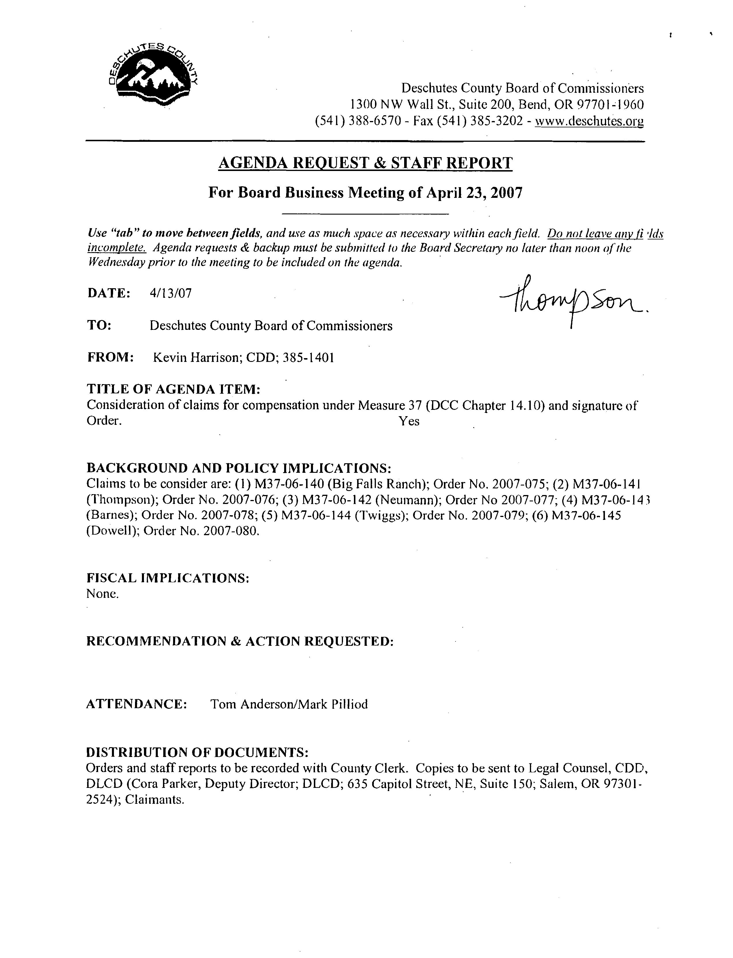 You have submitted written comments in response to the notice of the above -referenced Measure 37 claim. The Board is scheduled to review this claim and receive a written recommendation from the Administrator at their meeting on Monday, July 23, 2007, at 10:00 am in the Commissioner' s Hearing Room. Pursuant to DCC 14.10.090(C), you may present oral comments and rebut evidence in the record at this meeting. ( Note: This claim was originally scheduled for review on June 4, 2007.)