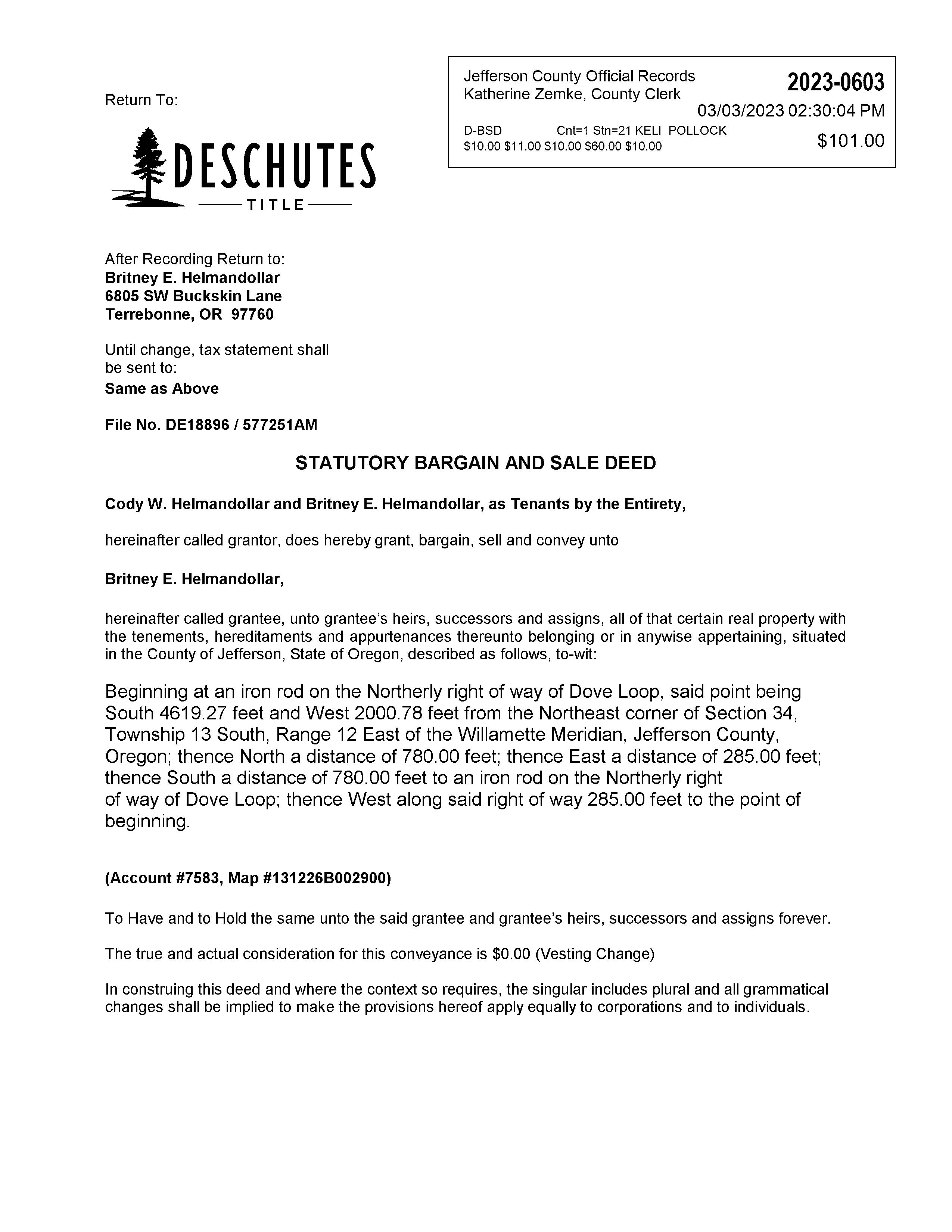 Deschutes County Title has provided this information as a courtesy and assumes no liability for the accuracy of the data and does not warranty the fitness of this product for any particular purpose. 6805 SW Buckskin Lane|Terrebonne|Oregon|97760 Bend 397 SW Upper Terrace Dr Bend, Oregon 97702 Office: 541.389.2120 Fax: 541.389.2180 Redmond 845 SW Veterans Way Redmond, Oregon 97756 Office: 541.527.1274 Fax: 541.527.1281 La Pine 51515 Huntington Rd La Pine, Oregon 97739 Office: 541.876.6990 Fax: 541.876.2740 St Helens 240 South First Street St. Helens, Oregon 97051 Office: 503.397.2587 Fax: 503.366.1708 HOMEBOOK www.deschutestitle.com