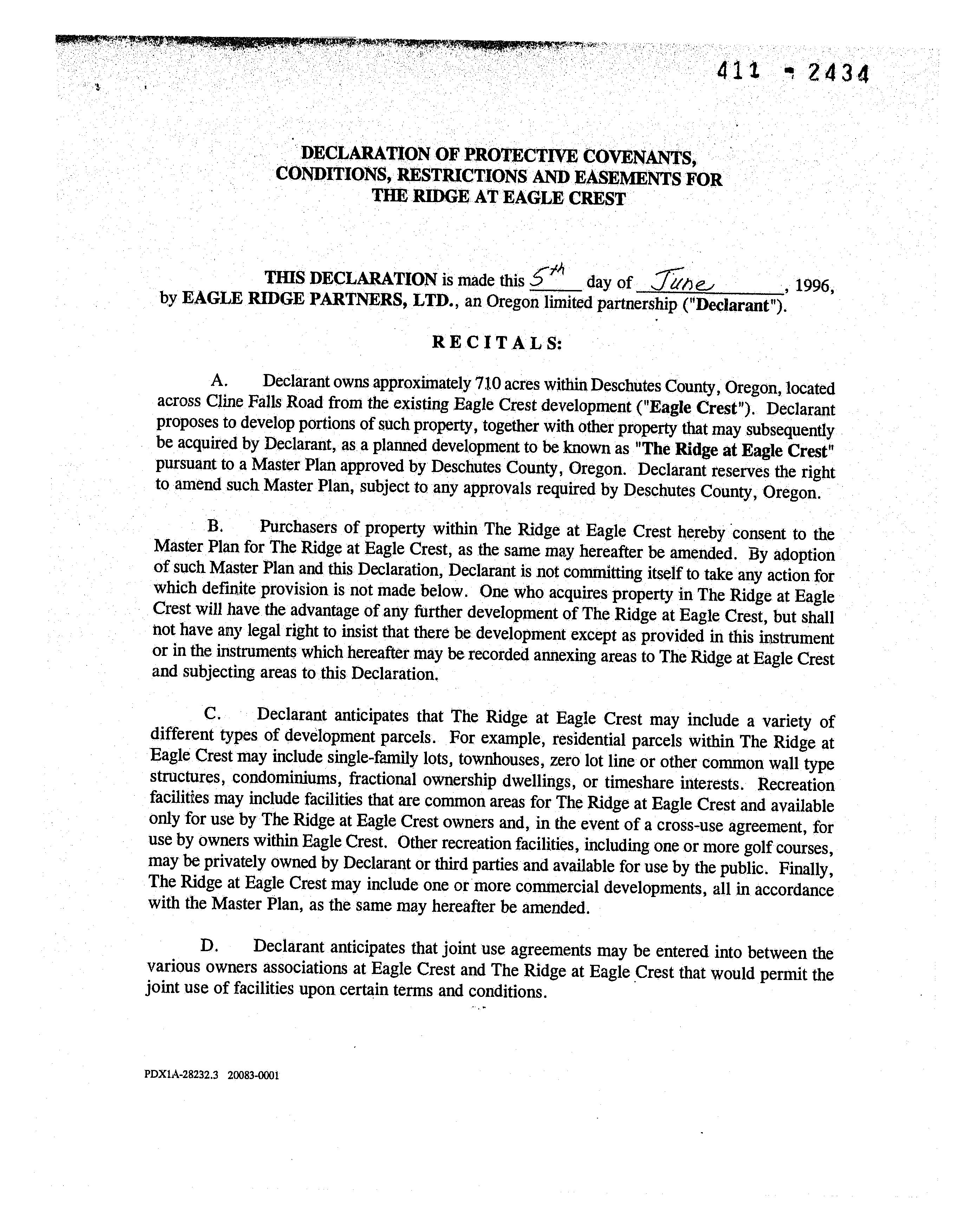 A. Declarant owns approximately 710 acres within Deschutes County, Oregon, located across Cline Falls Road fromthe existing Eagle Crest development ("Eagle Crest"). Declarant proposes to develop portions of such property, together with other property that may subsequently be acquired by Declarant, as a planned development to beknown as "The Ridge at Eagle Crest" pursuant to a Master Plan approved by Deschutes County, Oregon. Declarant reserves the right to amend such Master Plan, subject to any approvals required by Deschutes County, Oregon.