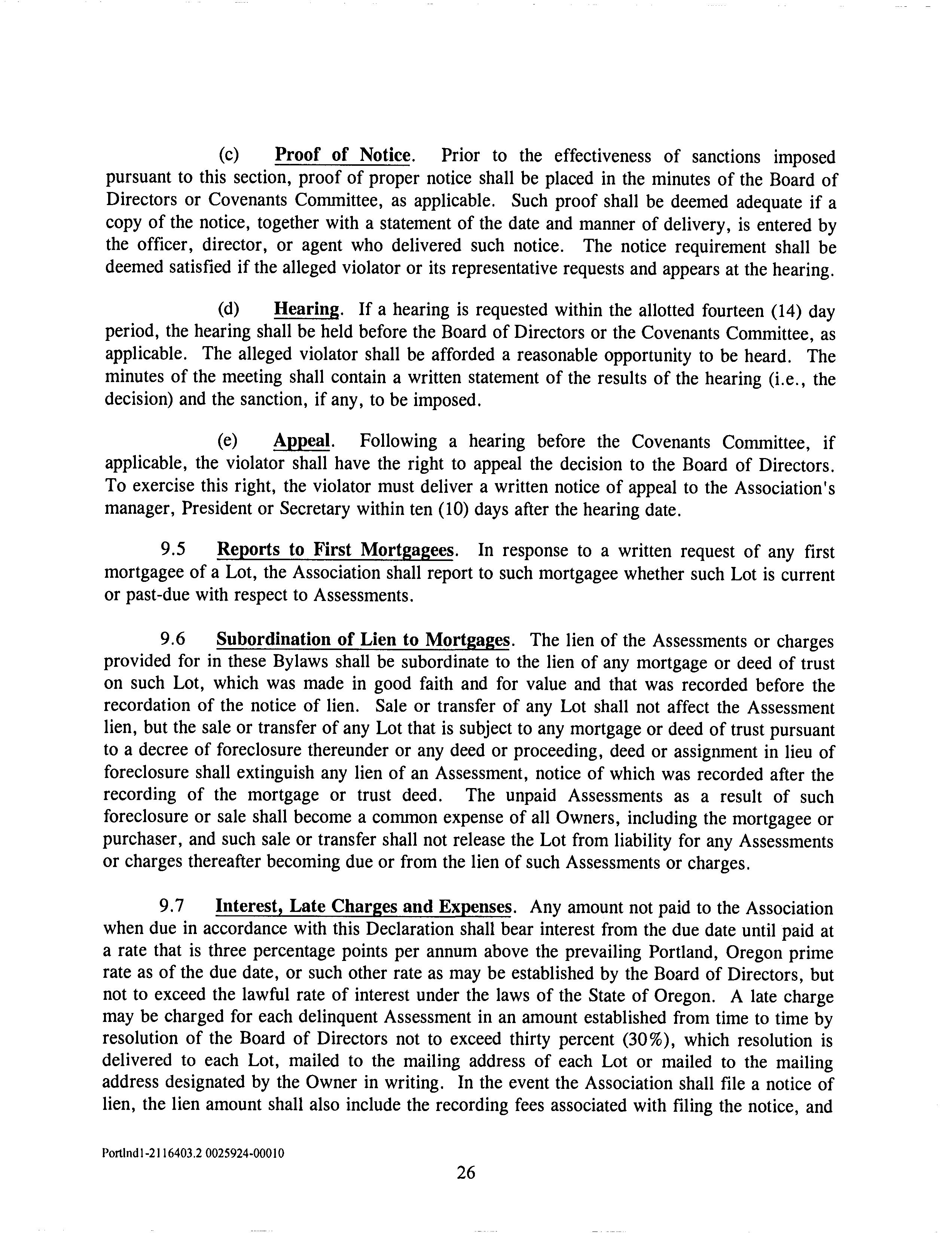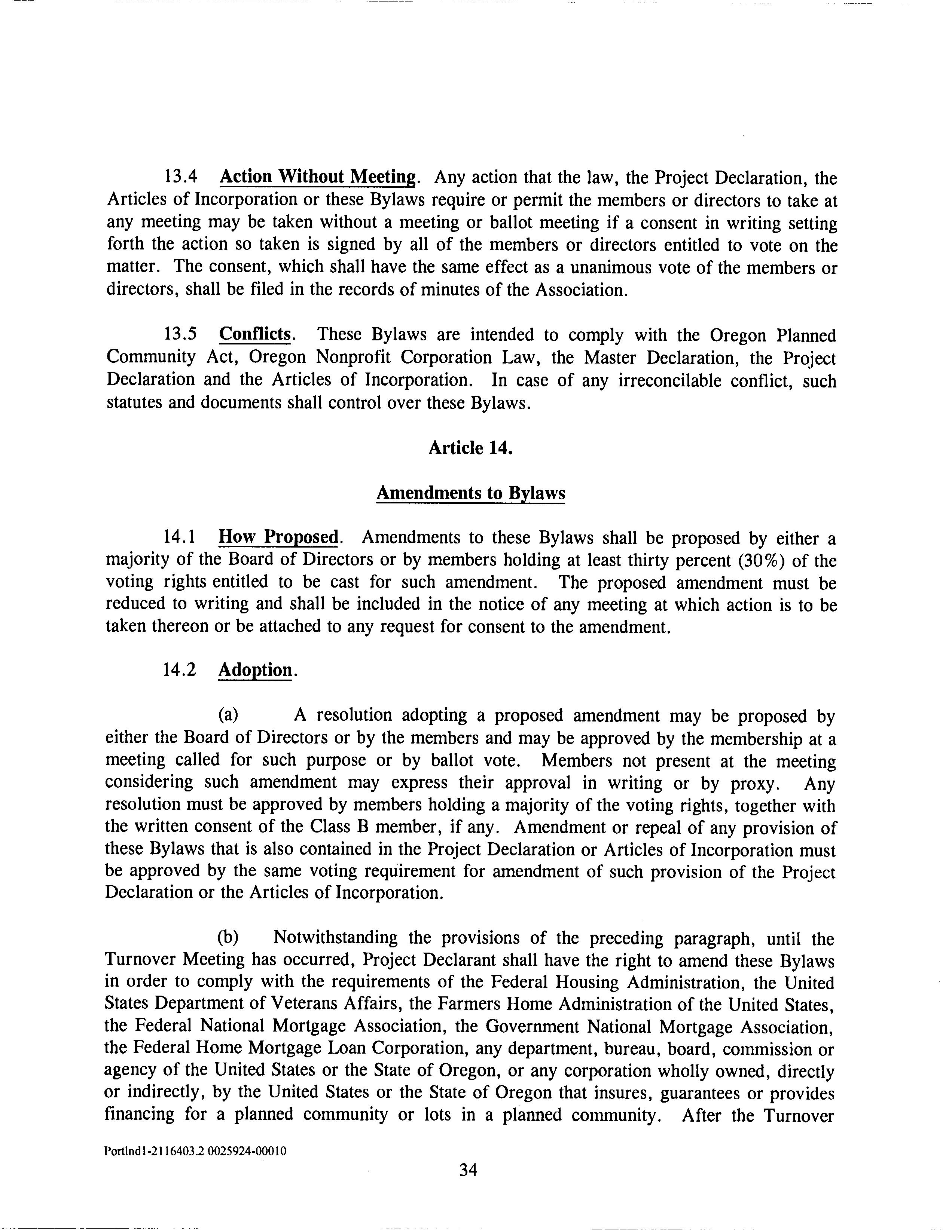 2.4 Withdrawal of Property. Declarant may withdraw property from The Ridge at Eagle Crest by an amendment to this Declaration executed by Declarant and recorded in the Deed Records of Deschutes County, Oregon. All voting rights otherwise allocated to Lots being withdrawn shall be eliminated, and the common expenses shall be reallocated to the remaining Lots as provided in Section 11.9 below. Such withdrawal may be accomplished without prior noticeandwithoutthe consent ofany Owner if such withdrawal (a) is of all or a portion of the Initial Development or Additional Property annexed pursuant to a declaration described in Section 2.2 at anytimepriorto the sale of the firstLotinthe plat ofthe Initial Development, or in the case of Additional Property, prior to the sale of the first Lot in the property annexed by a supplemental declaration, or (b) if the property to be withdrawn was originally included in error or if the withdrawal is forthe purpose of making minor adjustments to boundary lines which do not reduce the total number of Living Units. In addition, Declarant may withdraw any property then owned by Declarant or the Association if such withdrawal is a result of any changes in Declarant's plans forthe Property, provided that such withdrawal is not unequivocally contrary to theoverall, uniform schemeof development forthe Property and is approvedby a majority of the voting rights of the Association.