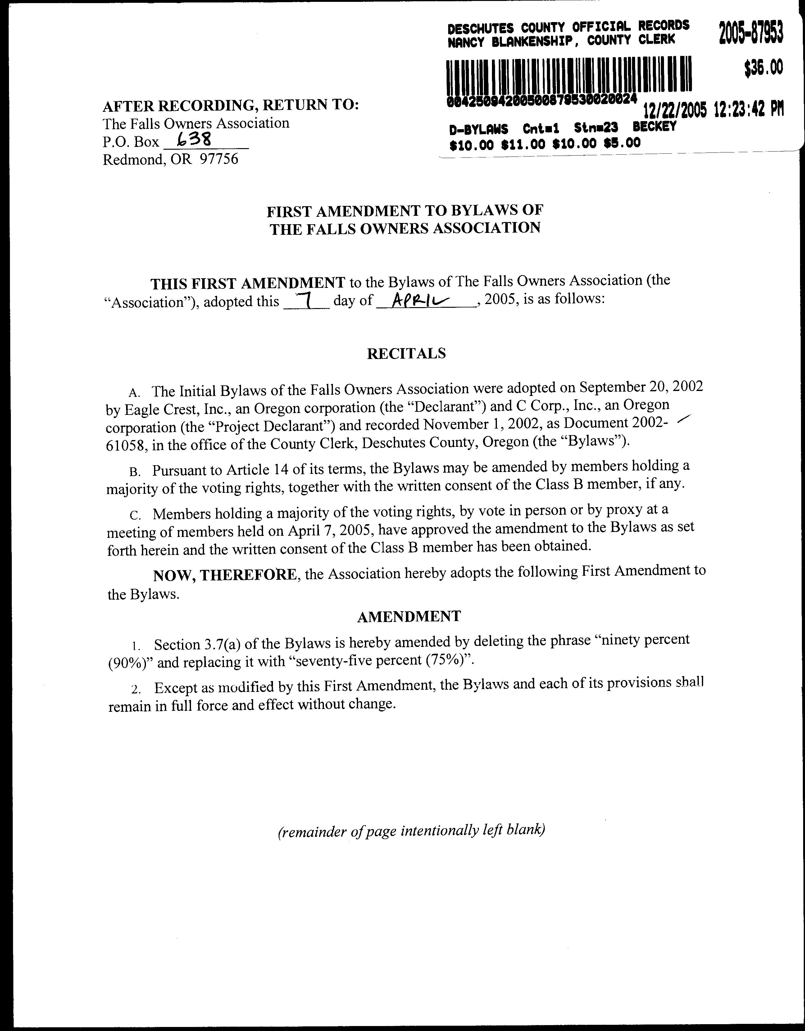 E. Declarant has recorded the plat of Eagle Crest II, Phase I in the Plat Records of Deschutes County, Oregon. Declarant proposes to subject the property described in such plat, except Lots 65-73, Red Wing Loop road, the parcel marked "Common Area D" and the parcel marked "DeveloperArea," as shown thereon, to the conditions,restrictions,charges and easements set forth inthis Declaration for the benefitofsuch property and its present and subsequent owners,and to establish such property as the first phase of The Ridge at Eagle Crest and as a separate Project within The Ridge at Eagle Crest to be known as "Eagle Ridge Homesites." Additional areas and Projects may be annexed to The Ridge at Eagle Crest in accordance with the provisions set forth in this Declaration.