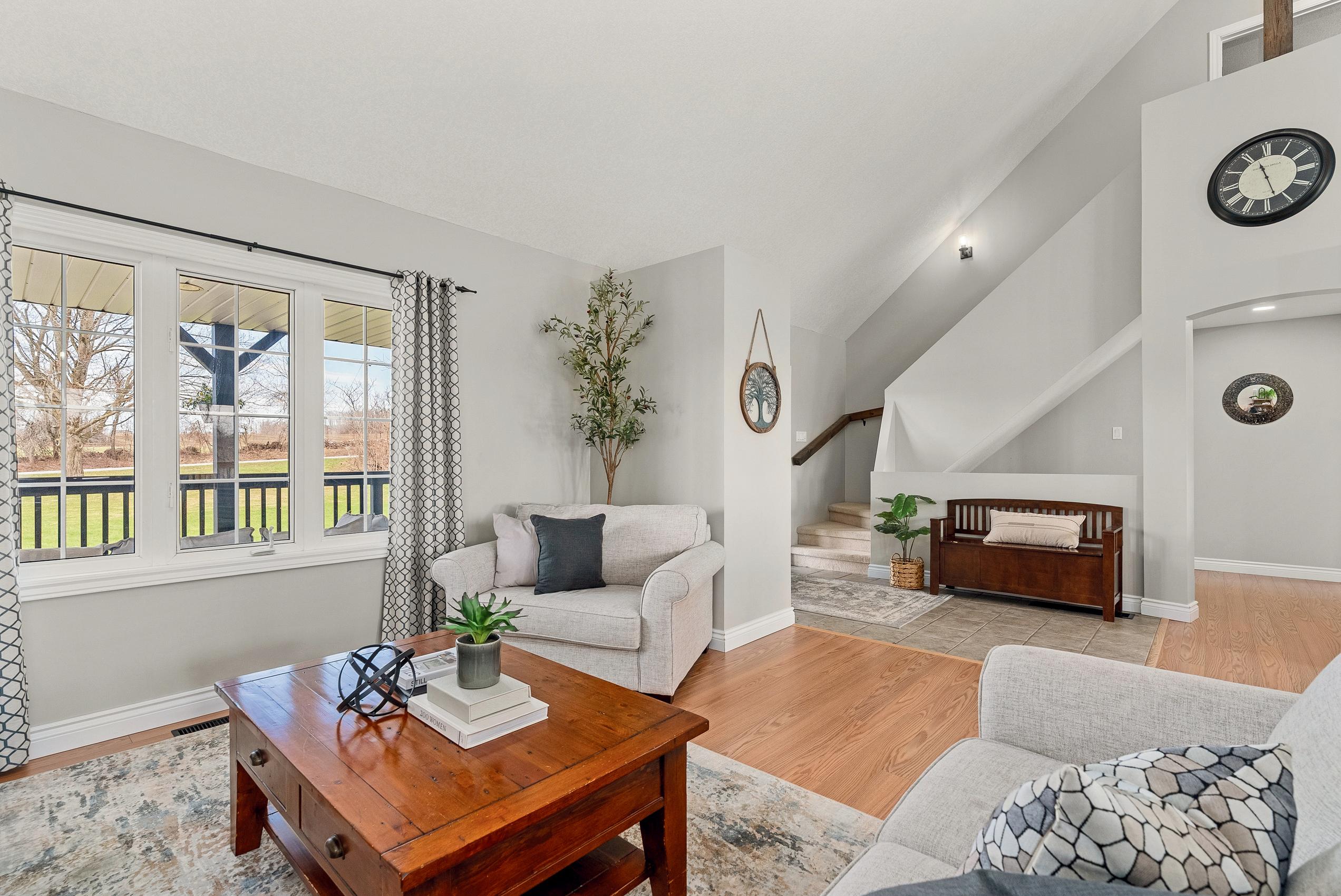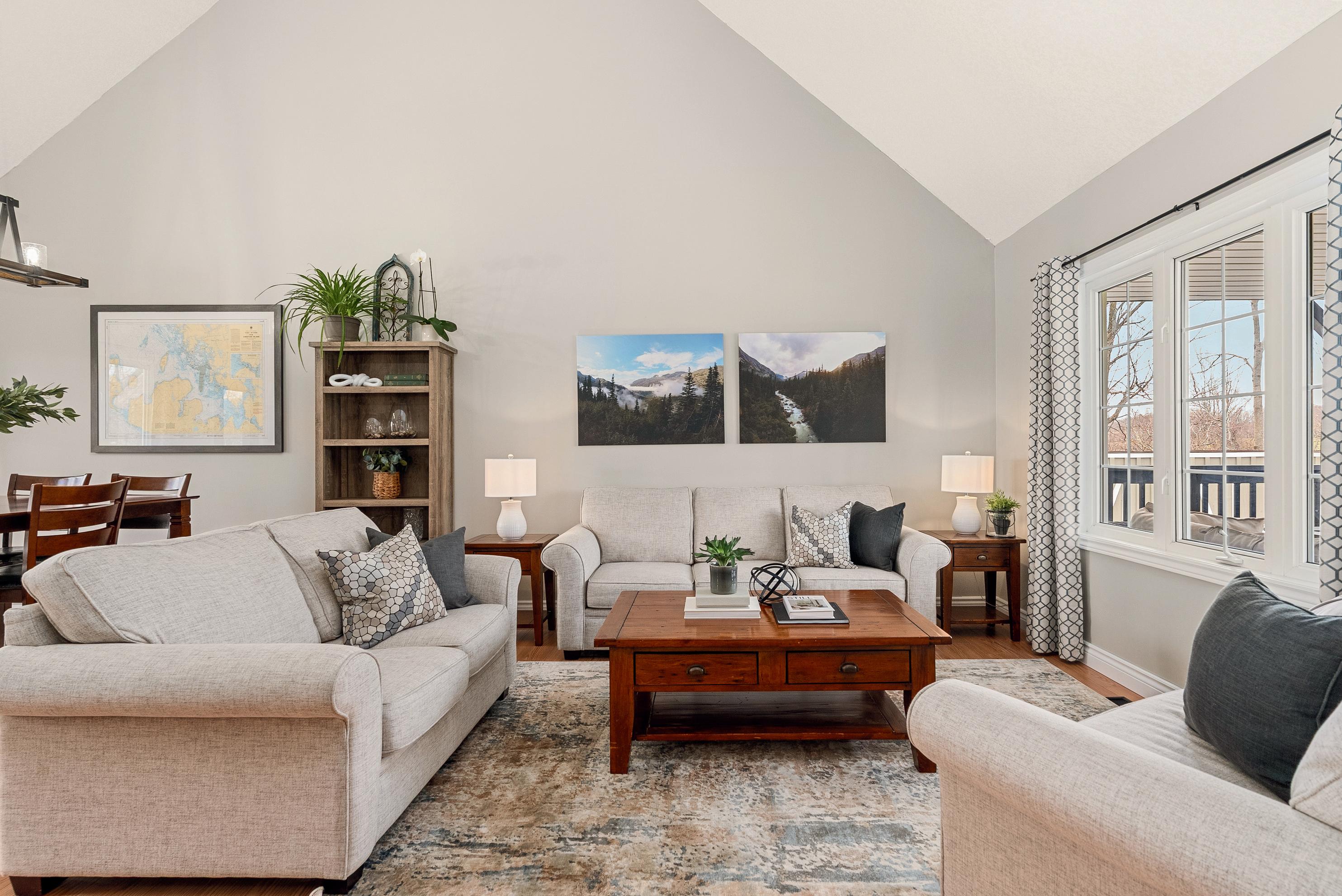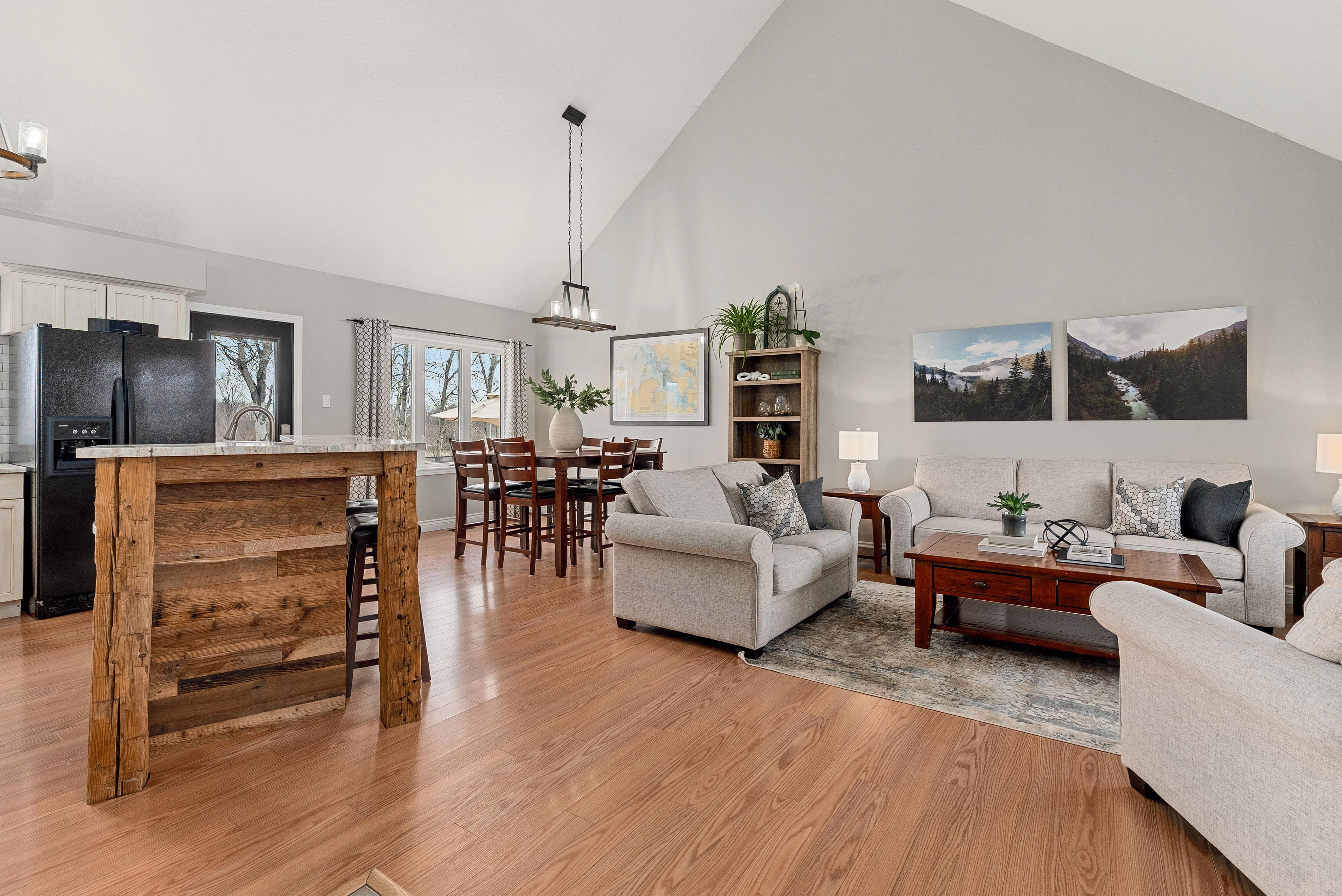 The main living space is bright and welcoming, featuring an open layout enhanced by cathedral ceilings and large windows that bring in natural light and surrounding views. Designed for both everyday living and gathering, this area offers a comfortable and functional setting with a natural sense of flow.