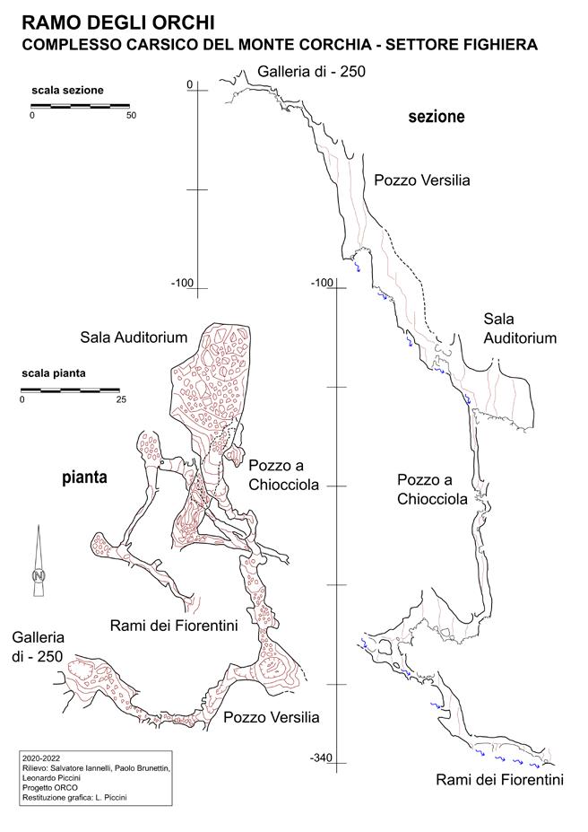 del P.60 fino ai Rami dei Fiorentini, dove attualmente si necessita la conclusione del rilievo e il disarmo. Su iniziativa e organizzazione di Paolo Brunettin è stato ripreso un lavoro iniziato nel 2011 e sospeso nel 2014 dal gruppo di Forte dei Marmi, sul ramo che dalla “Buca del Papi” (18° ingresso del Complesso) si riallaccia alle “Gallerie Dei Maremmani”. Qui abbiamo conclusoncludendone il rilievo per uno sviluppo totale di 331 m su -250 m di dislivello e disarmato l’intero ramo in un totale di 3 uscite avvenute fra i mesi di settembre e ottobre. In occasione del corso sulle colorazioni organizzato dalla FST, su iniziativa di Leonardo Piccini sono state riviste alcune diramazioni fra “Ramo del Fiume-Ramo dei Romani-Suzanne” producendo circa 150m di rilievo nuovo. Sempre su iniziativa di Leonardo, nello stesso periodo, abbiamo dedicato un paio di punte all’esplorazione della parte inferiore del “Ramo di Via Fani”, dove la via “classica” passa su un livello intermedio, mentre la base della forra si trova circa a 100 metri di dislivello più in basso, seguendo uno sviluppo indipendente che va poi ad intercettare il pozzo “Tao Quian” alla base del quale riparte un meandro abbastanza “selettivo e bagnato”con destinazione ignota dove rimane attualmente un fronte aperto.