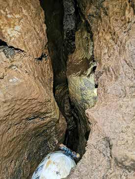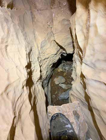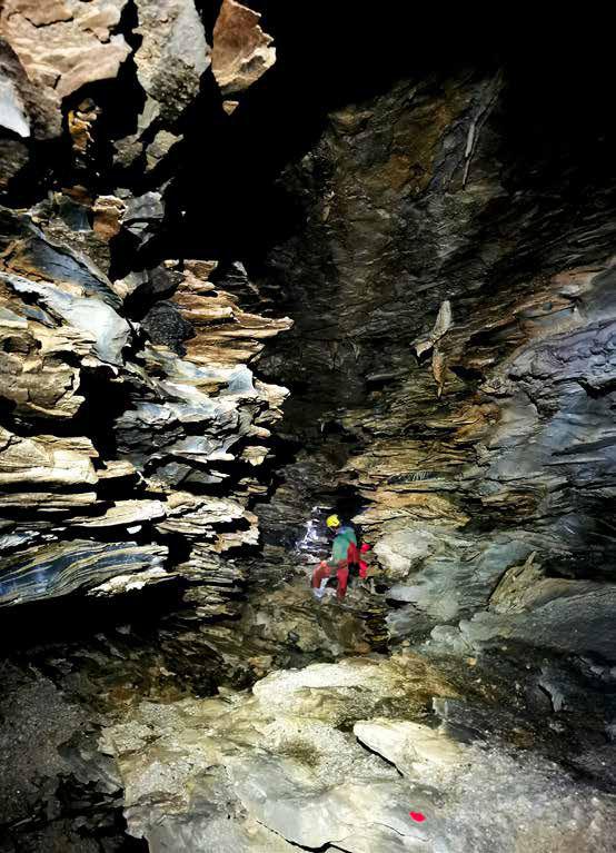 ternativi, intanto disarrampico e dopo pochi metri sembra chiudere, ma ecco che dietro l’angolo si apre un meandro abbastanza selettivo e dalle pareti completamente ricoperte da uno spesso strato di fango nero... Quindi per capire se é finita qui o no, devo infilarmi li dentro?? Sento arrivare la Discepola Maria Maddalena e il maresciallo con delle corde, io proseguo nel “Marron Glacé” per capire se ne vale la pena mettere una corda e far scendere anche gli altri... Dopo circa dieci metri di meandro dove evitare di scivolare diventa un’impresa, comincio a sentire riecheggiare alcuni rumori, un altra curva secca ed ecco che mi affaccio su un ambiente enorme.