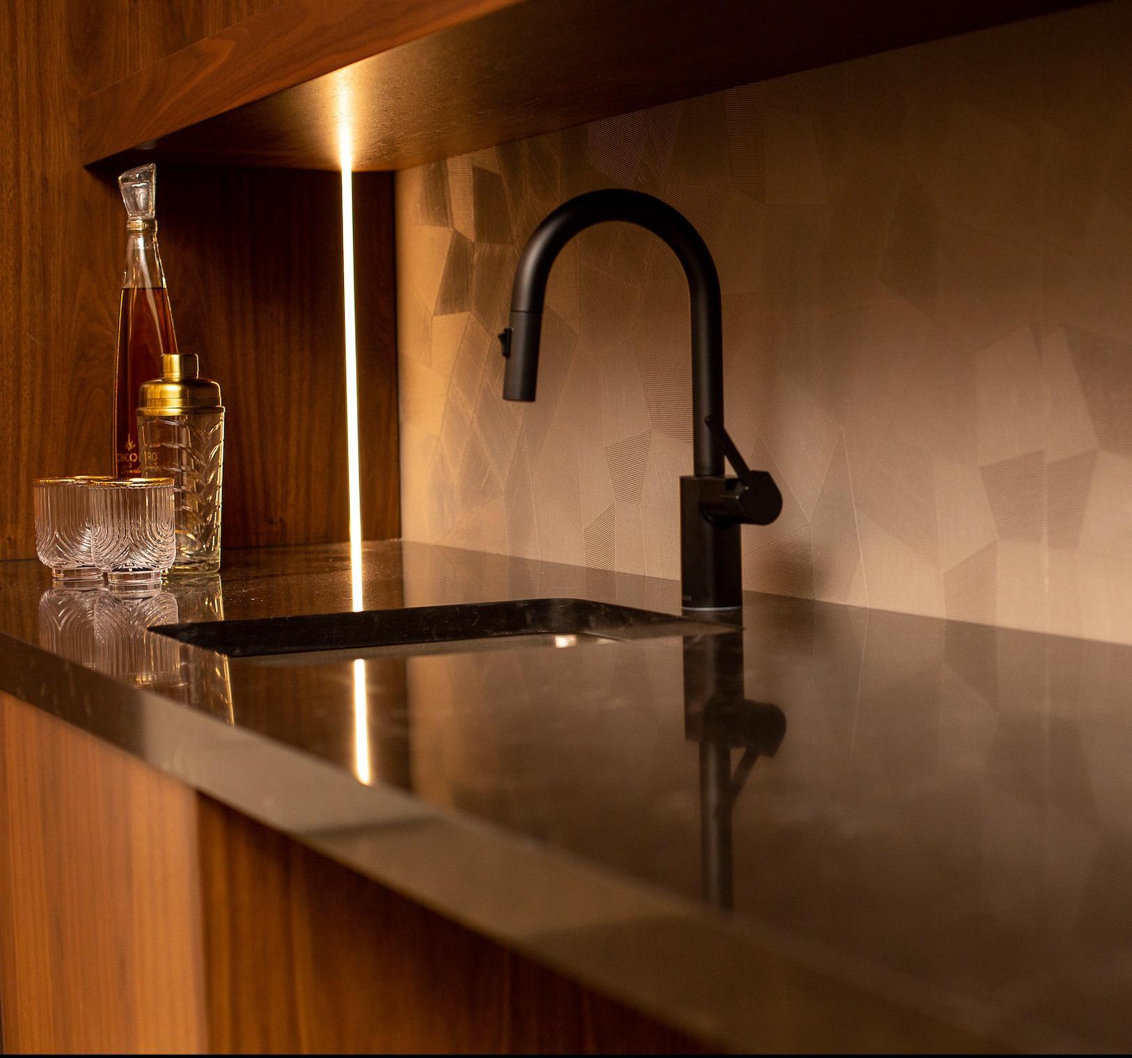 A sleek and refined space with a built-in beverage center and bar sink for added convenience. Textured wallpaper and a curated gallery wall showcase family photos, creating a warm and personal atmosphere in a more private area of the home.