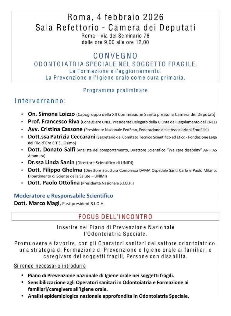 L’anno si apre con un momento significativo: il convegno nazionale del 4 febbraio 2026 presso la Camera dei Deputati, dedicato all’Odontoiatria Speciale nel soggetto fragile, alla formazione e alla prevenzione come cura primaria. Un’occasione di ascolto e di proposta, in cui professionisti, associazioni e rappresentanti istituzionali si incontrano per riportare al centro del dibattito pubblico il tema dell’igiene orale e della presa in carico delle persone con disabilità.