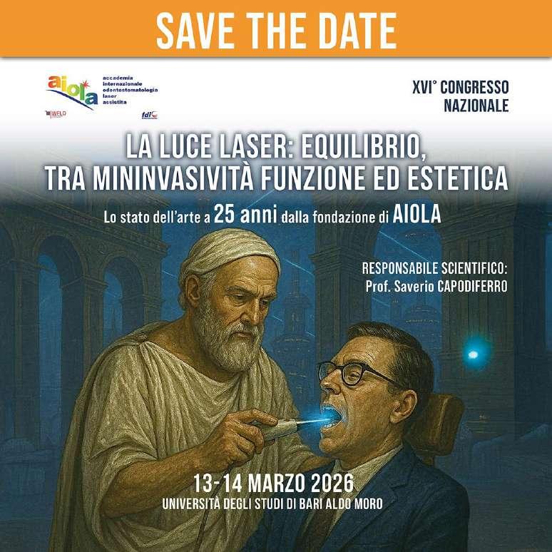 Il XVI congresso di AIOLA che si terrà a Bari il 13 e 14 Marzo 2026 rappresenterà un momento di incontro di tutta l’Odontoiatria laser italiana e sarà patrocinato dalle più prestigiose Società Scientifiche, Enti, Università Italiane e Straniere. Parteciperanno infatti società scientifiche come SILO e ANTEHC, e gran parte delle Scuole Universitarie Italiane che da tanti anni dedicano una buona parte della loro attività didattica alle tecnologie laser, le aziende più rappresentative ed anche ospiti internazionali che daranno ancora più risalto all’evento. Le giornate congressuali saranno articolate in 3 corsi precongressuali al venerdì mattina dedicando una buona parte di essi anche alla medicina estetica e chirurgia estetica laser del volto, ed ai neofiti di laserterapia odontoiatrica con un corso dedicato ai primi passi e con applicazioni pratiche su pezzi anatomici. Inoltre, un intero corso precongressuale anche in collaborazione con AIDI sarà dedicato alla figura degli Igienisti Dentali e all'utilizzo di tali tecnologie per quella che è la loro specifica competenza. Il congresso partirà il venerdì pomeriggio e andrà avanti fino al sabato pomeriggio con un programma ricco ma soprattutto orientato ad affrontare tutte le tematiche relative alle applicazioni laser sia nel cavo orale sia sul volto, con le ultimissime novità su dispositivi e tecniche. Saranno anche accettate e discusse a mezzo di poster digitali le co-