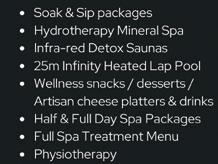 relaxation massage, hot stone back massage, organic coconut and argan oil head massage with hot towel infusion, skin smoothing body polish, and a hydrating or detox body mask.