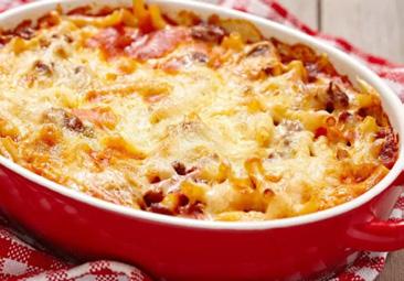 500 g de macarrão cozido e escorrido, 300 g de bacon cortado em cubinhos, 3 tomates cortados e sem semente, 1 cebola grande picada, 1 cebola grande picada, 3 colheres (sopa) de maionese, 2 dentes de alho picados, 2 colheres (sopa) de azeite, 350 g de mussarela ralada ou picada, 50 g de queijo ralado