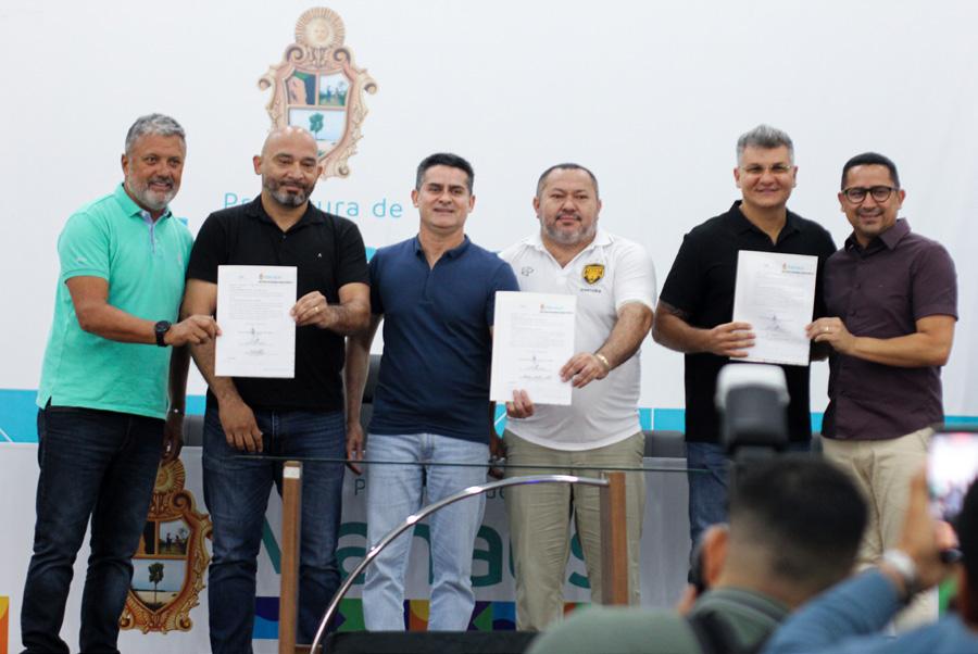 A Prefeitura de Manaus, oficializou, ontem, 10/6, o patrocínio para os clubes de futebol da cidade que estão disputando o Campeonato Brasileiro. A ação contempla o Amazonas FC, representante na Série B, o Manauara e o Manaus FC, que estão na Série D. No total, serão investidos R$ 2,5 milhões pela gestão pública. Para o prefeito David Almeida, o apoio é fundamental para que as equipes sigam obtendo bons resultados e movimentando a modalidade na cidade. “Esses times movimentam a grande massa, uma grande paixão. Nós estamos fomentando um convênio para que esses três times possam utilizar esses recursos, acreditando no esporte, e que a gente possa subir o Amazonas para a Série A, e também o Manauara e o Manaus para a Série C, para que a gente possa ter grandes espetáculos na nossa cidade”, afirmou David.