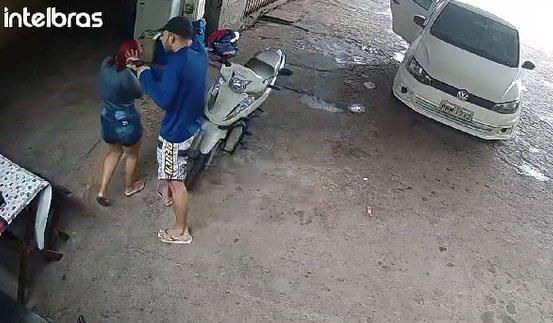 As imagens mostram o momento em que um carro modelo Voyage, de cor branca, com a placa PHM-1712, chega ao estabelecimento e estaciona. Em seguida, dois suspeitos armados desceram do veículo e dispararam alguns tiros.