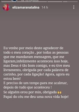 "Eu venho por meio deste agradecer de todo o meu coração, por todas as pessoas que me mandaram mensagem, que me ligaram. Infelizmente, aconteceu isso hoje. Mas, Deus é tão bom comigo e eu tive meu livramento. Obrigada por cada palavra de carinho, por cada ligação! Agora eu estou bem!", escreveu a técnica de enfermagem nas redes sociais.