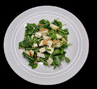 100 gramas de rúcula; 100 gramas de gorgonzola cortado em cubos (ou queijo de cabra); 1 pera cortada em cubos; 1/2 xícara de chá de nozes picadas; 3 colheres de azeite de oliva; 1 limão-siciliano ou taiti; Sal e pimenta-doreino a gosto.