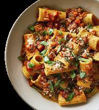 Sal e pimenta; 6 colheres (sopa) de azeite extra-virgem; 450 gramas de berinjela italiana, descascada e picada em pedaços de pouco mais de meio centímetro (4 xícaras cheias); 170 gramas de cogumelo-de-paris; 1/2 xícara de cebola branca; 1/2 xícara de cenoura; 3 dentes de alho, picados; 2 colheres (sopa) de extrato de tomate; 3 xícaras de caldo de cogumelos (ou caldo de legumes); 1 xícara de tomates inteiros enlatados, esmagados com as mãos; 1 colher (chá) de orégano seco; 1 ramo de manjericão, mais manjericão picado para guarnecer; 450 gramas de rigatoni, fusilli ou outra massa curta; 2 colheres (sopa) de manteiga sem sal e parmesão fresco ralado para servir