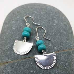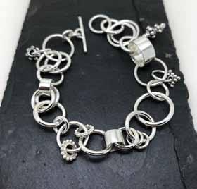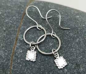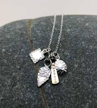 She has been looking at the surfaces and textures of leaves, seeds and natural forms to change slightly the way she makes her jewellery. Her pieces are more natural in shape, less uniform, with the surfaces patinated, chased and hammered. She works predominantly in sterling silver, but can make any of her designs in gold.