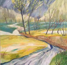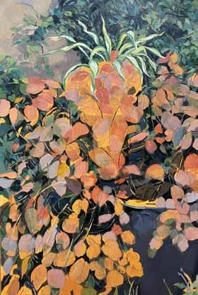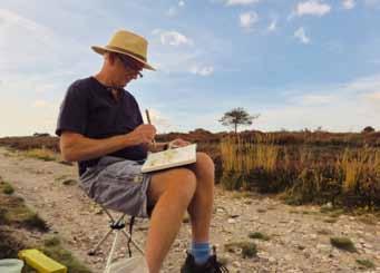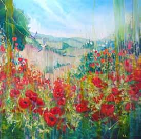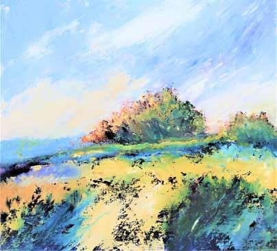 You may be surprised at the rural setting, the attractive barn, the numbers of contemporary oil and acrylic paintings on display! Warm, colourful and expressive palette knife work to delight – from inspiration of sea and land; pictured here (opp top), my vibrant view of climbing the hill.