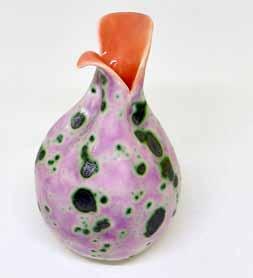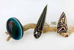 c-wise from left: Brenda Hartill 'Eye in the Sky I' 2020, mixed media, Rye; Andy Young, Trio of Rings: Fordite, Surfite and Silver, Hadlow; Carol Smith 'Pink Seed Pod' ceramic, Chatham; Cali Wilson 'Raining in Hastings...Time for Tea' acrylic on wood, Tonbridge; Maria Turner 'Venezia' oils, Tunbridge Wells; Paul Chave 'Hello Mister' fused glass, Hadlow; Frances Featherstone 'Continuum' oil on board, Groombridge