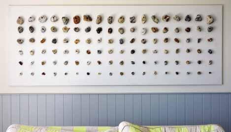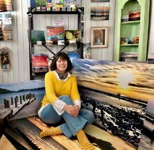 top left: tealight holder printed with one of Cathy's beautiful beachscapes; above: Cathy Verney in Blue View Art Studio surrounded by her work.