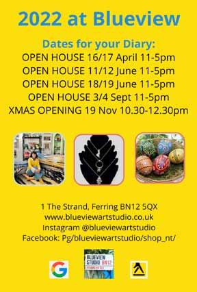 Contact: 07990 521587; email: blueviewartstudio@ gmail.com; www.instagram.com/blueviewartstudio and www.facebook.com/blueviewartstudio www.blueviewartstudio.co.uk