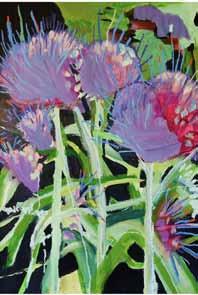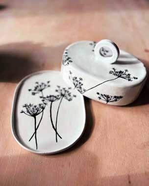 from top: Andrew Milne, sketching with pastels in situ; Helen Hunt, Goldfinch; Linda Wells, Seed Head Butter Dish, ceramic; Fay Bishop, Iris