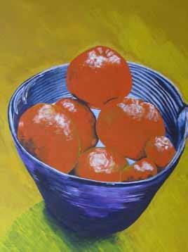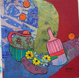 below: Scilla Allen, Blue bowl of oranges; right: Em Fry, Plant study, lilac flowers; opp page, right: Susanne Hopkinson, collage. Adur Arts