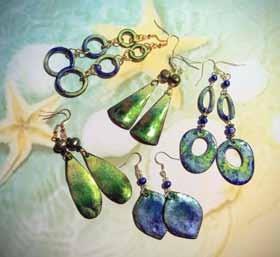 clockwise from opp top left: Horsham Artists – Angela Brittain, Me and My Bestie; Karin Pfannenschmidt, Boogie Street 1; Pat Wright, Iron Men; Jane Cole, Enamel glass pearl earrings; Pippa Honess, Vases; Steve Bicknell, The Silent Child; Ailsa Quinlan, Hope.