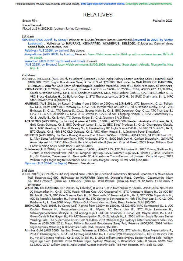 The Recipient of the Godolphin sale profiles and information warrants that they rely on their own inspection and inquiries in respect to the Thoroughbred which is the subject of the profile and information and not on any representation of Godolphin or its contractors, employees or any other agent, attorney or affiliates of Godolphin.