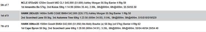 TRAINER: OWNER: CAREER: PRIZEMONEY: In Training since 25/03/2025 69 16.0