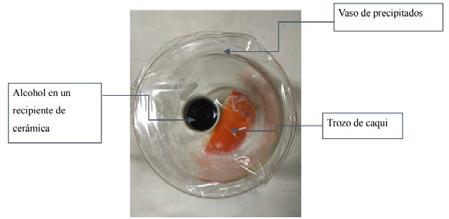 El montaje consistió en introducir una cuarta parte de un caqui junto con 5·10-3 dm3 de alcohol en un vaso de precipitados de 0’600 dm3 de capacidad.