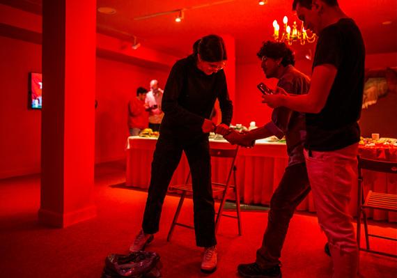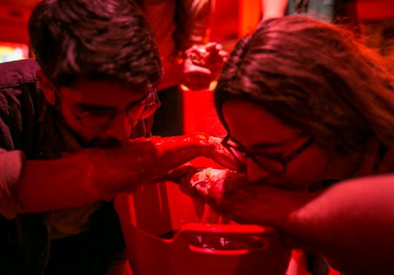 poder preparar ciertos platos, como puré de patatas, una tripa rellena (con colorante rojo) para simular sangre artificial, unos ojos de hielo, flores comestibles…etc. Cada día de pruebas y experimentos encontrábamos ciertas formas de consumir los platos para luego recrearlos en la performance. Además, comenzamos a repetir una breve coreografía de gestos y movimientos que debíamos realizar durante la primera escena y la última, en la que entraba un músico y tocaba una pieza con chelo.