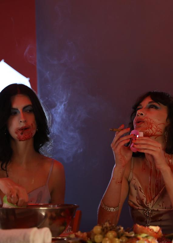 Comenzamos a componer desde el concepto de Mukbang, uno de los aspectos que caracteriza toda la exposición y los contenidos que planteaba cada una de sus integrantes. Victoria y yo tuvimos una serie de encuentros en las que me hablaba de su idea de la performance, que consistía en colocar a dos personajes en una mesa alargada, dónde irían degustarían distintos platos que unos científicos irían sirviendo. Una vez planteada la idea, Victoria me comentó que quería que yo co-dirigiera el proyecto performativo con ella e incluyera el imaginario de terror vintage que suelo trabajar en la mayoría de mis composiciones Ambas fuimos hilando de manera orgánica y natural la estructura de la propuesta, así como la estética, muy inspirada en el cine de terror Giallo de la década de los 70s y 80s, mezclado con el género de ciencia ficción y el erotismo de esa época. Organizamos todo el material, armando carpetas en Google Drive, realizando listas de cada una de las referencias que nos inspiraban. Por ejemplo, una de las primeras listas fue sobre directores/películas que correspondían a este género de terror, tales como: