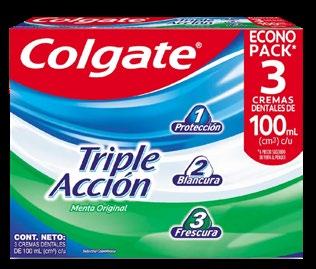 ADVERTENCIAS Y PRECAUCIONES: TOTALDENT ACCIÓN 3 EN 1 CREMA DENTAL (NSOC63733-24PE): En caso de estar recibiendo flúor de otras fuentes, consulte a un odontólogo o médico. No se recomienda el uso en menores de 6 años. No ingerir. COLGATE SENSITIVE PRO-ALIVIO (NSOC977-9P) / XTREME (NSOC23319-23CO): La sensibilidad en los dientes puede indicar un problema serio que exige la supervisión de un odontólogo. Si los síntomas no desaparecen en cuatro semanas suspenda su uso y busque la orientación de un profesional. No ingerir. Producto sin acción terapéutica. Mantenga fuera del alcance de los niños. No requiere eliminación específica. COLGATE TOTAL CARBÓN ACTIVADO (NSOC16573-22CO) ORIINAL MINT (NSOC41260-25CO) ANTISARRO (NNSOC9769-19C): La sensibilidad en los dientes puede indicar un problema serio que exige la supervisión de un odontólogo. si los síntomas no desaparecen en cuatro semanas suspenda su uso y busque la orientación de un profesional. no ingerir. producto sin acción terapéutica. mantenga fuera del alcance de los niños. COLGATE TRIPLE ACCIÓN (NSOC72336-16CO): Su uso es recomendable para niños mayores de 6 años. Niños de 6 años y menores: usar una cantidad de tamaño de una gota (0.25 g) supervisados por un adulto para minimizar que sea ingerida. No ingerir mantenga fuera del alcance de los niños.