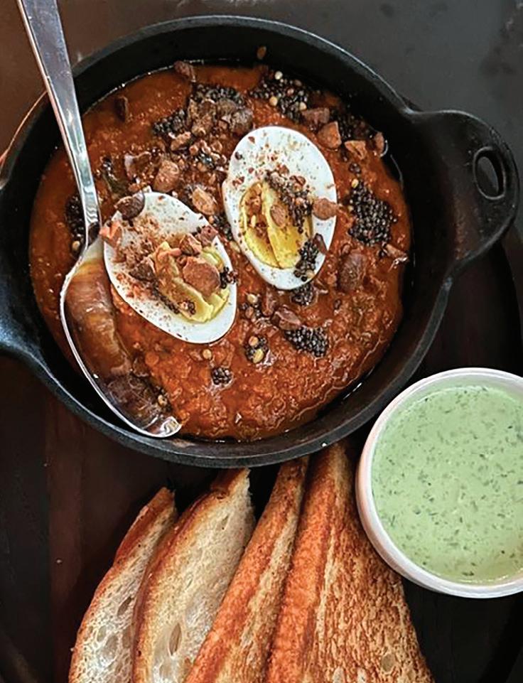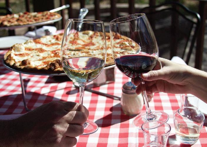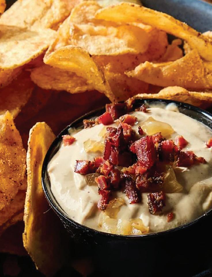 The food menu leans into comfort, led by kitchen manager Mela nie McDowell, who makes the pizza dough and sauces inhouse. Piz zas come in small or large, but the large is the clear choice—after all, leftover pizza is a gift to your future self. You can build your own, but house creations make the decision easier. The Good Boy Combo piles on sausage, onions, black olives, and green peppers, while the Canine Classic is unapologetically loaded with all the meats. For something a little “swicy” (that’s both sweet and spicy) the Sweet Heat layers Canadian bacon, pineapple, and jalapeño and red-pepper flakes. It’s the kind of pizza that disappears before you realize you’re full. Starters include jalapeño-popper cheese bread you’ll regret not ordering, plus a house salad for balance, or at least the illusion of it.