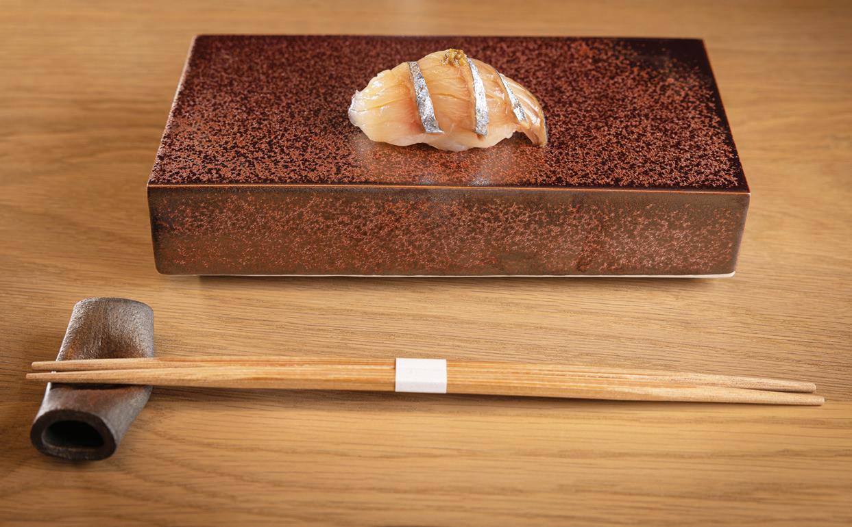 Then came the parade of nigiri, each one a small, fleeting study in balance. Striped jack-topped warm rice with fermented yuzu kosho and a drizzle of five-year-aged koshu sake. Ocean trout followed, silky with chopped yuzu peel and kelp salt. Akami bluefin was brushed with emulsified A5 wagyu fat and soy—meaty, savory, irresistible.