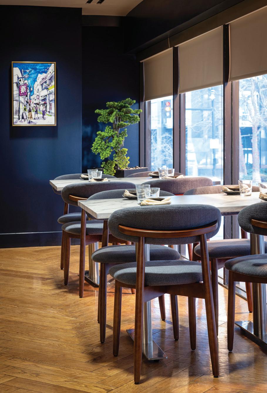 the bar and ceiling, glowing against charcoal walls. Low ceilings, soft music, and a packed room give the restaurant an electricity that feels more like Tokyo than a Midwestern hotel lounge.