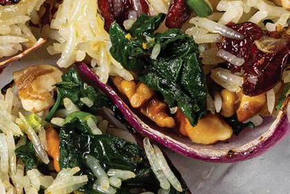It probably doesn’t need to be said, but spoiled and decaying foodstu s can never be made into something delicious and wholesome. In fact, decaying food can become toxic, so if it looks bad, smells bad, or has a furry little coat or shimmers with unappealing colors, send it to the compost bin immediately. On the other hand, wilted lettuce, slightly shriveled produce or herbs, leftover toasted bread or rice (that hasn’t been time and temperature abused), these are foods that can have a second chance at useful life. e rice, leftover from testing for this month’s Pantry column, and a basket of red onions sitting near the stove and showing hints of new growth, provided the inspiration for the following recipe.