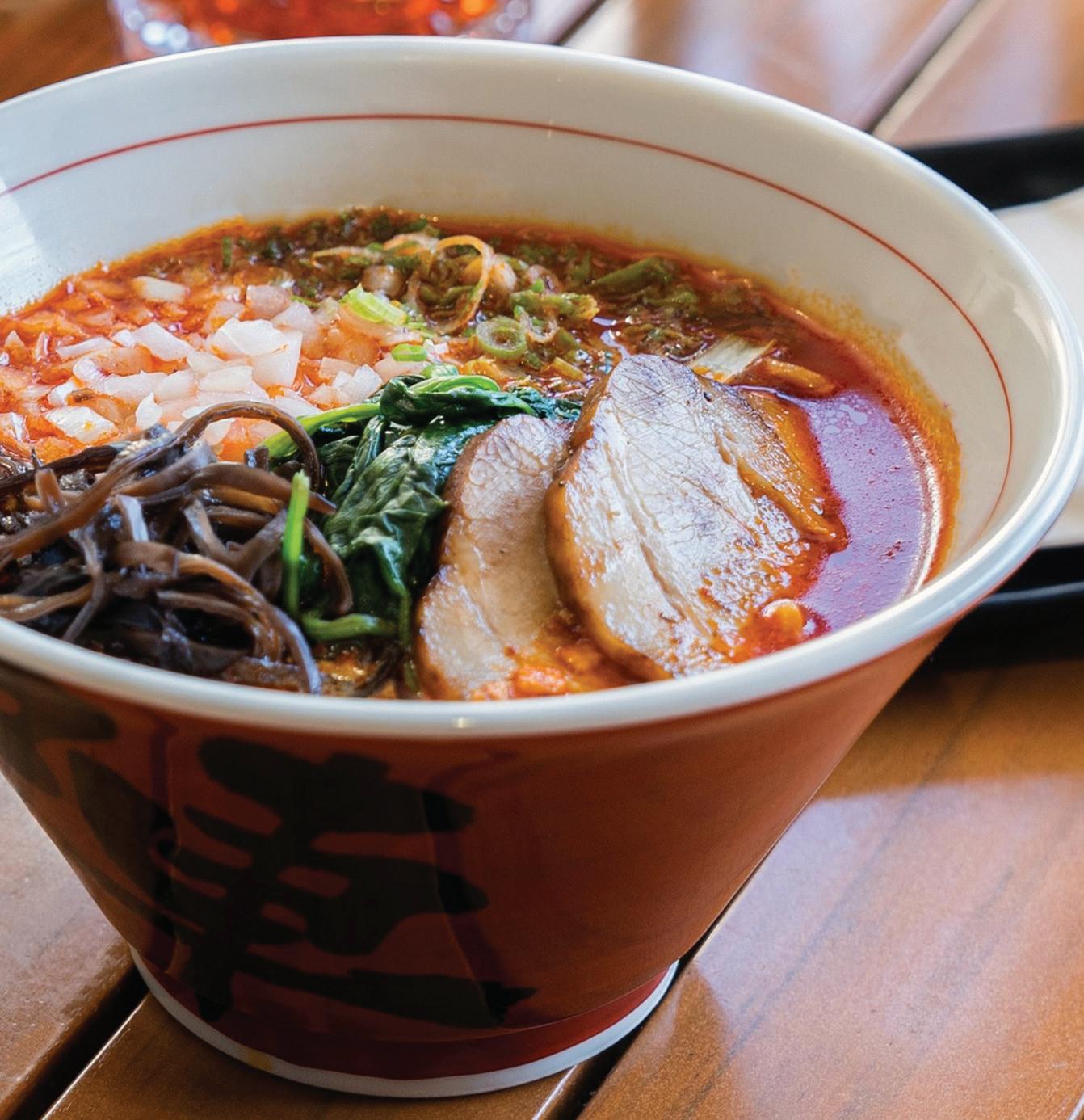 ALTHOUGH THE SOUTHERN SUBURBS of Kansas City have traditionally been where some of the best Asian cuisine in the city can be found, there hasn’t been a strictly Japanese-inspired ramen shop any further south than 75th Street until now. Jinya Ramen Bar recently opened in the Bluehawk Shopping Center at 159th S treet in Overland Park, Kansas. This is the first location in Kansas for the Los Angeles-based chain, which offers 13 different steaming hot ramen bowls featuring their signature full-flavored pork bone broth, in addition to small plates, including gyoza, pork belly chashu, cr ispy rice squares topped with spicy tuna, and sautéed shishito peppers, along with salads and rice bowls. The 3,000-square-foot restaurant features an open kitchen, full patio, and bar serving sake flights, Japanese whisky, and a carbonated Toki highball served from a quick chill Suntory Hoshizaki dispenser. jinyaramenbar.com
