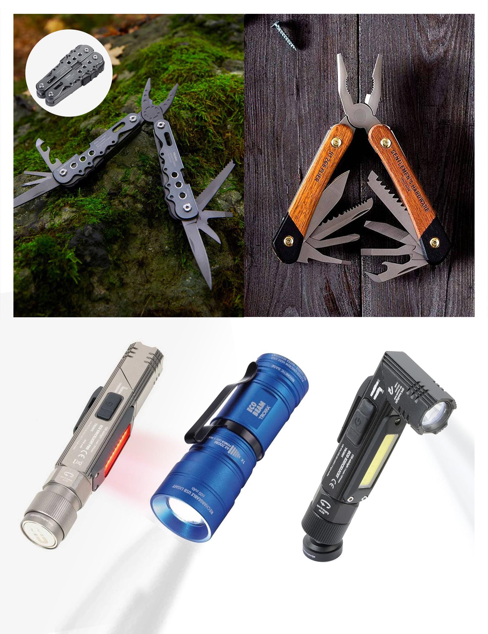 Cortadores de alambre, destornilladores, lima, abrebotellas, cuchillo dentado y cuchillo convencional.