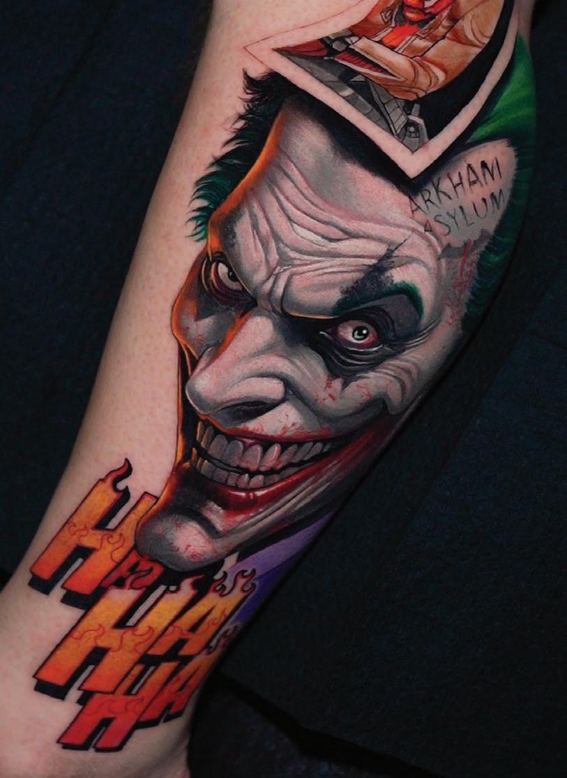 Your tattoos also have an interesting balance between realistic elements, lettering and cartoonish illustration. How do you create this balance? Does it vary based on the subject matter? Explaining how to create a balance is not easy. It just happens, l guess. Sometimes l use the idea from the client and put all the elements together that I use to create my style, and I start with a picture or a character that l like. It can be a movie character or an iconic image—l just move them around and create the elements to establish my style